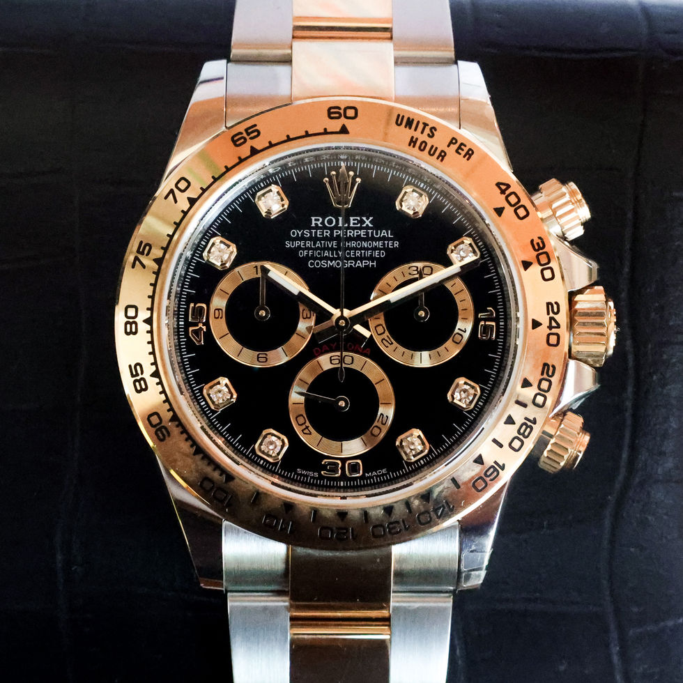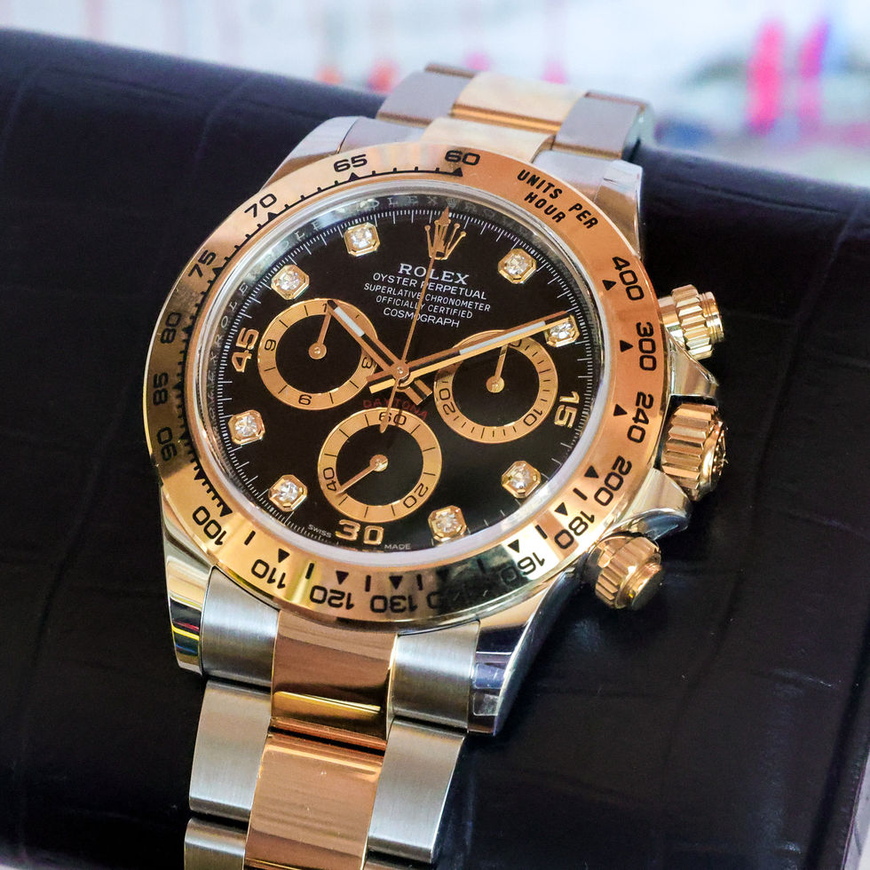 Elevate your collection with the Rolex Daytona reference 116503, a striking two-tone chronograph that embodies both prestige and performance. Crafted in a 40mm Oystersteel and 18k yellow gold case, the watch features a fixed gold bezel engraved with a tachymetric scale and a black dial set with diamond hour markers. The two-tone Oyster bracelet with Oysterlock clasp ensures durability while delivering unmistakable elegance. Powered by the in-house Caliber 4130 movement, this Daytona remains a benchmark of horological craftsmanship.