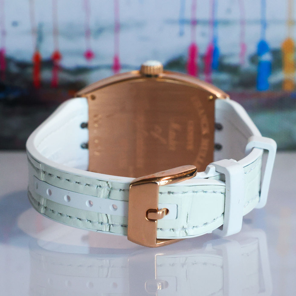 Highlights - 35mm x 48mm 18k rose gold case - Silver dial with vibrant Color Dreams numerals and blued steel hands - Date window at 6 o’clock - White alligator leather strap with 18k rose gold tang buckle - Additional blue, pink, and red leather straps - Franck Muller Caliber FM 2800 automatic movement - Hours, minutes, seconds, date, and jumping hour functions - 42-hour power reserve - 30m water resistance