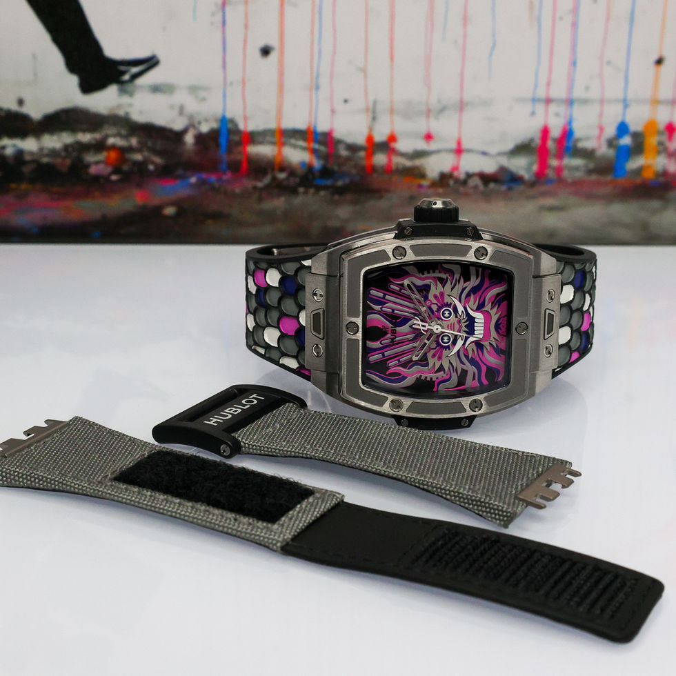 The Hublot Spirit of Big Bang “CHF24” ref. 646.NX.6600.RX.CHF24 showcases the brand’s unmistakable fusion of avant-garde design and haute horlogerie. The 42mm tonneau-shaped case, crafted in lightweight titanium, frames a vibrant multicolor dial with tones of purple, blue, and pink that shift with the light. A gray outer chapter ring, polished and satin finishes, and a seamless gray rubber strap complete this visually arresting composition.