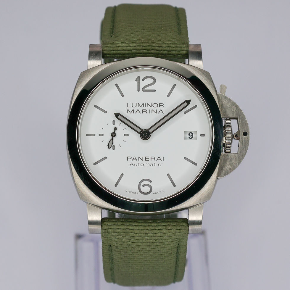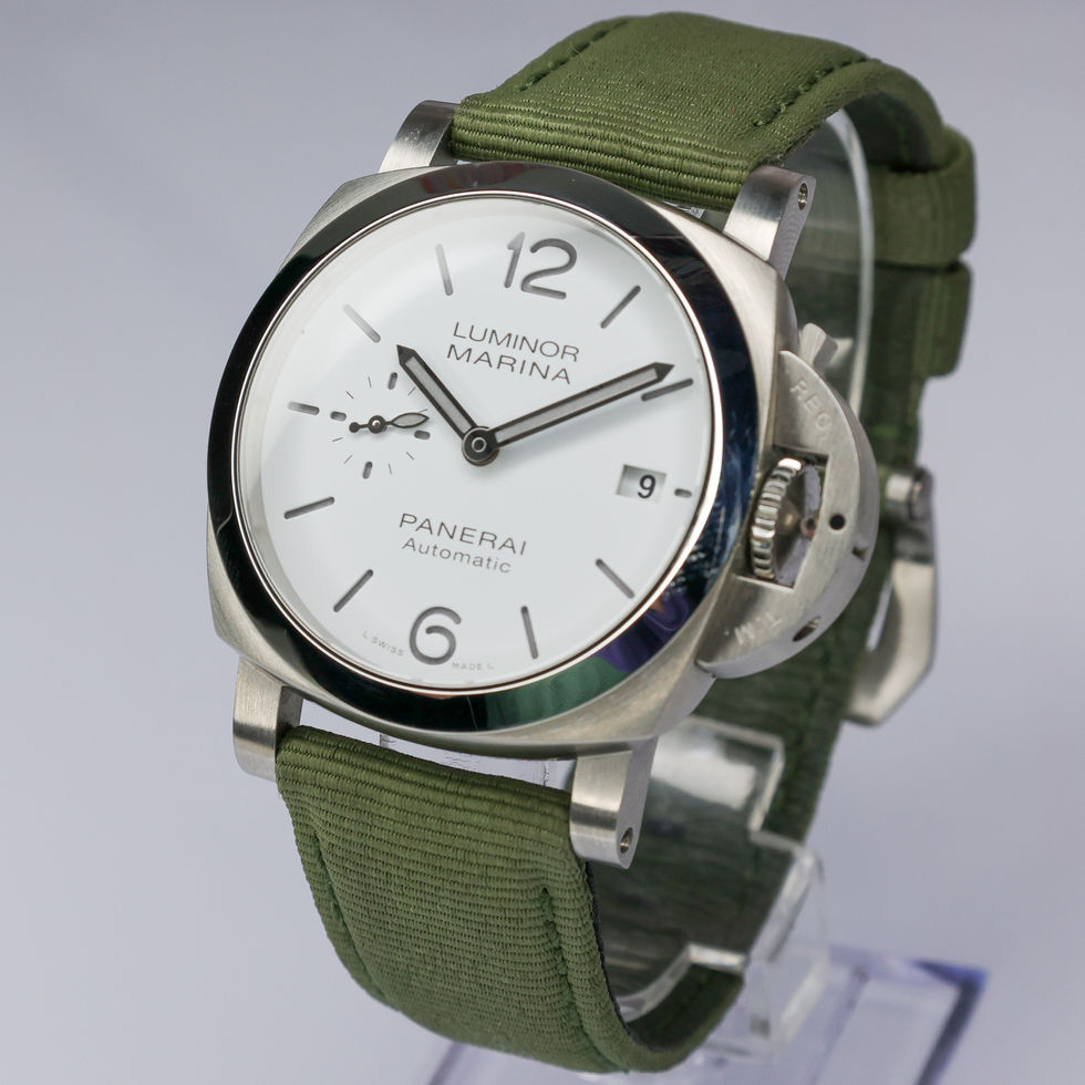 The Panerai Luminor Marina Quaranta PAM 01271 refines the brand’s iconic design into a versatile 40mm stainless steel case, making it a perfect modern expression of the Luminor line. Its crisp white dial, featuring luminous Arabic numerals, hands, and a small seconds subdial at 9 o’clock, ensures clean legibility. Powered by the automatic Calibre P.900 with a 72-hour power reserve, the watch delivers both reliability and elegance. Paired with a black alligator strap, and complemented by a wide array of additional strap options, this reference adapts easily to any occasion.