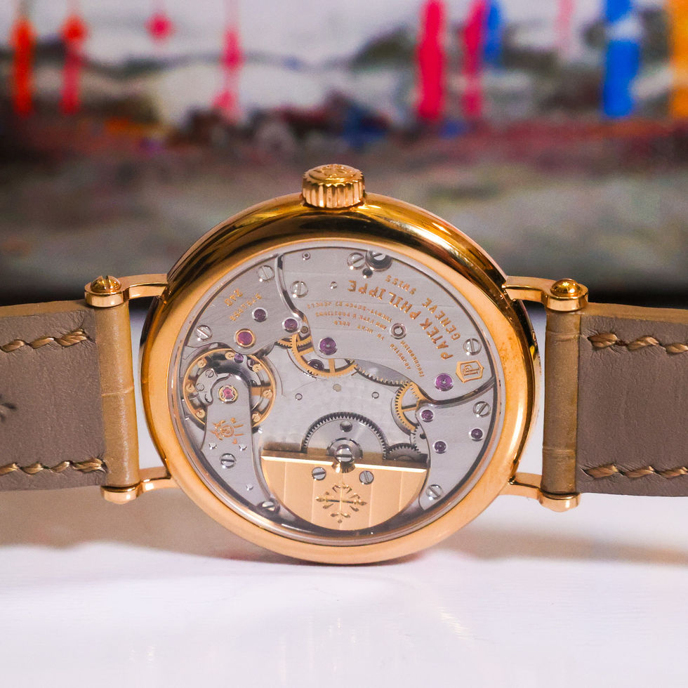 Sapphire exhibition caseback showcasing the Patek Philippe Caliber 240 automatic movement