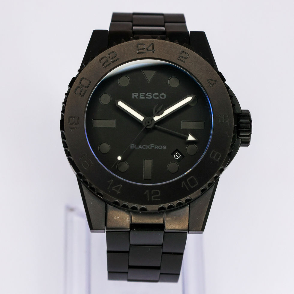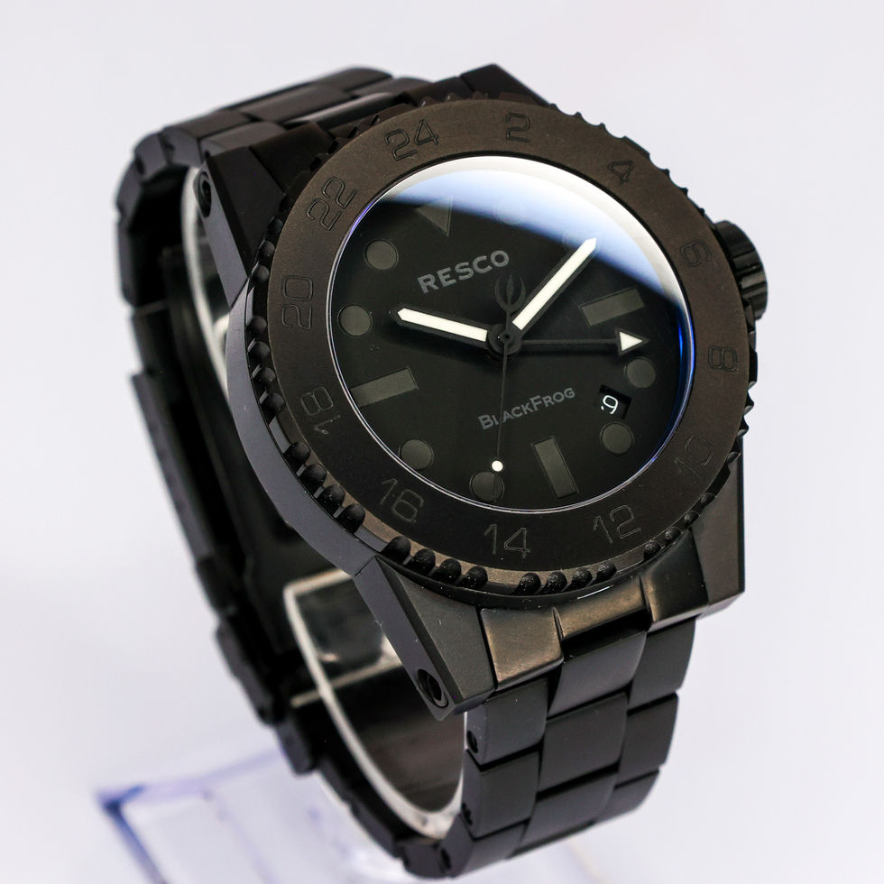 The Resco BlackFrog Gen2 blends tactical reliability with Swiss precision, built for those who demand durability in the field. Measuring 42mm, its stainless steel case is coated in black PVD for a rugged finish, paired with a matching PVD-coated bracelet. The black dial with luminous markers ensures legibility in all conditions, while the Swiss-made ETA 2824-2 automatic movement delivers trusted performance. With 200m water resistance and multiple strap options, the BlackFrog Gen2 offers adaptability for any environment.